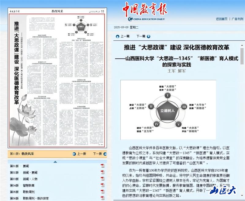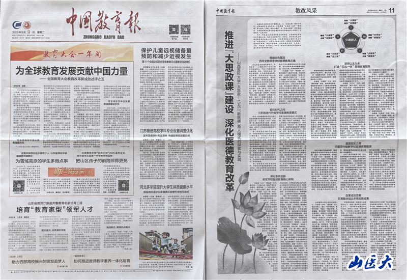 9月9日,《中国教育报》“教改风采”版刊发我校党委书记王军、校长解军的署名文章《推进“大思政课”建设 深化医德教育改革——山西医科大学“大思政—1345”“新医德”育人模式的探索与实践》。