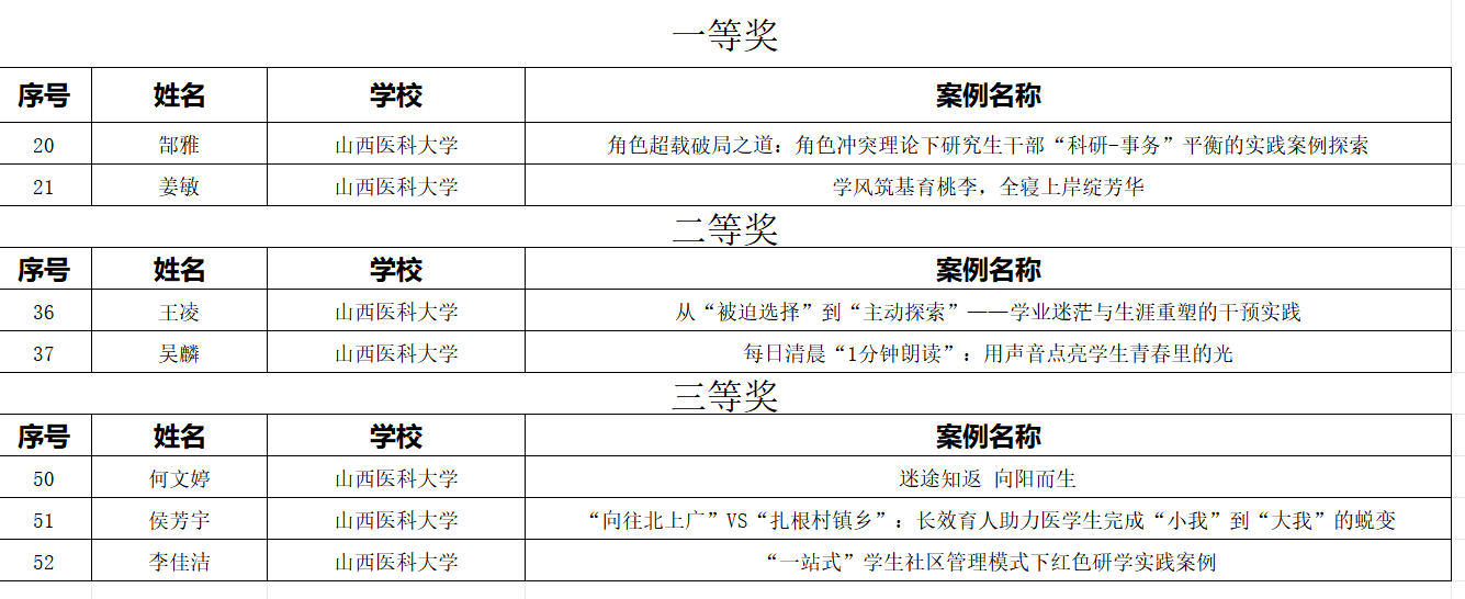 具体获奖情况为:郜雅、姜敏获一等奖;王凌、吴麟获二等奖;何文婷、侯芳宇、李佳洁获三等奖。获奖案例内容涵盖学生思想引导、学业发展、生涯规划、行为养成等多个方面,充分展现了我校辅导员队伍扎实的专业素养和育人实效。
