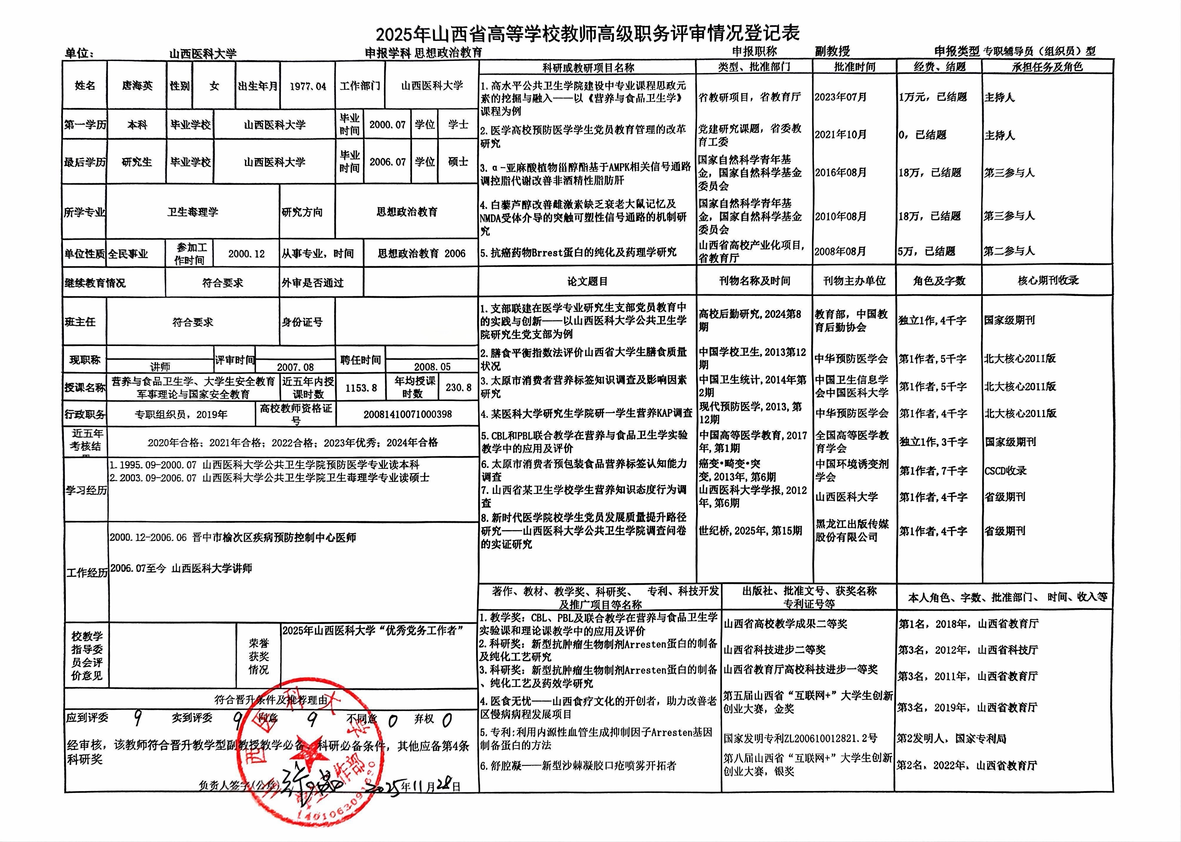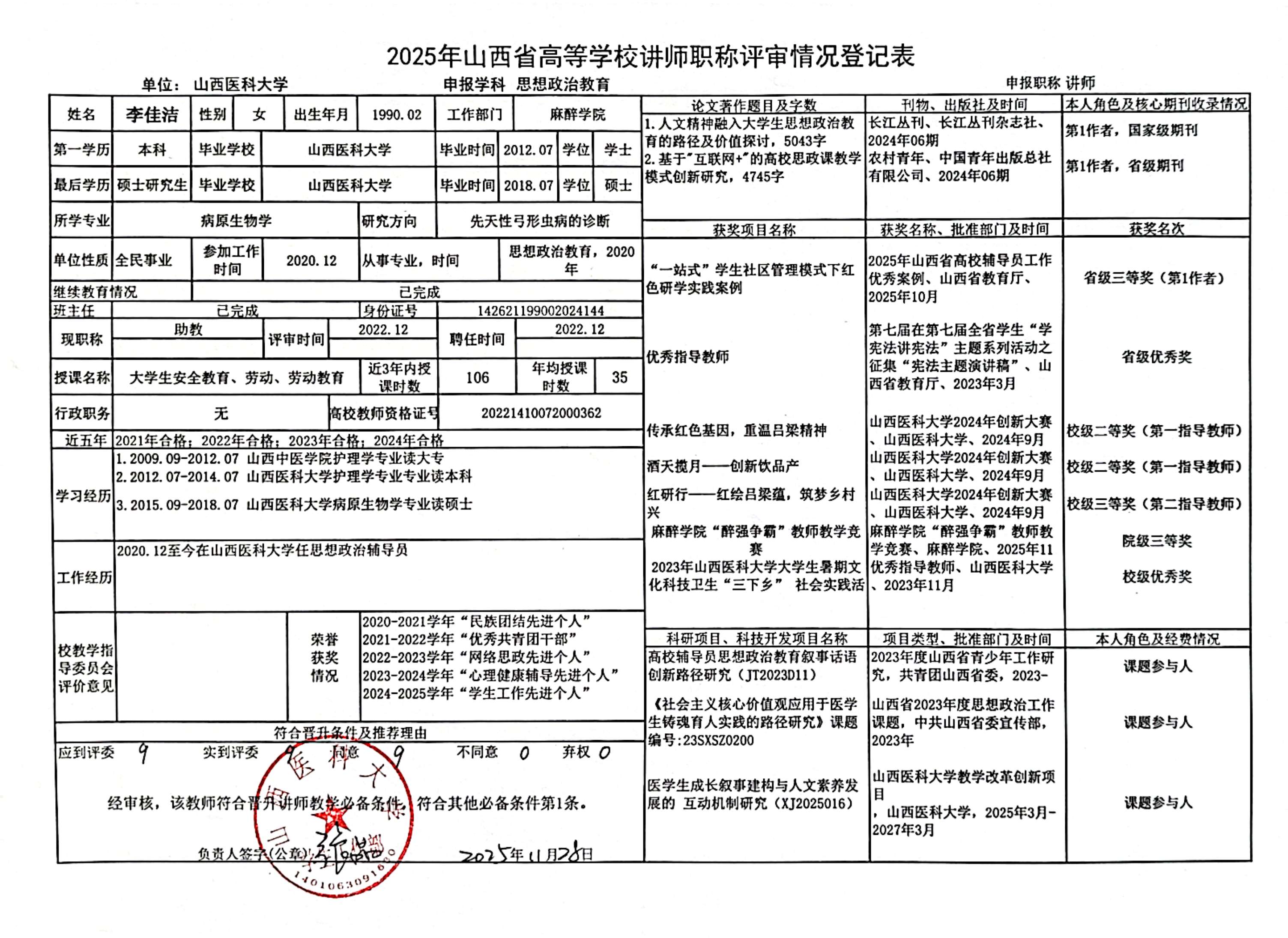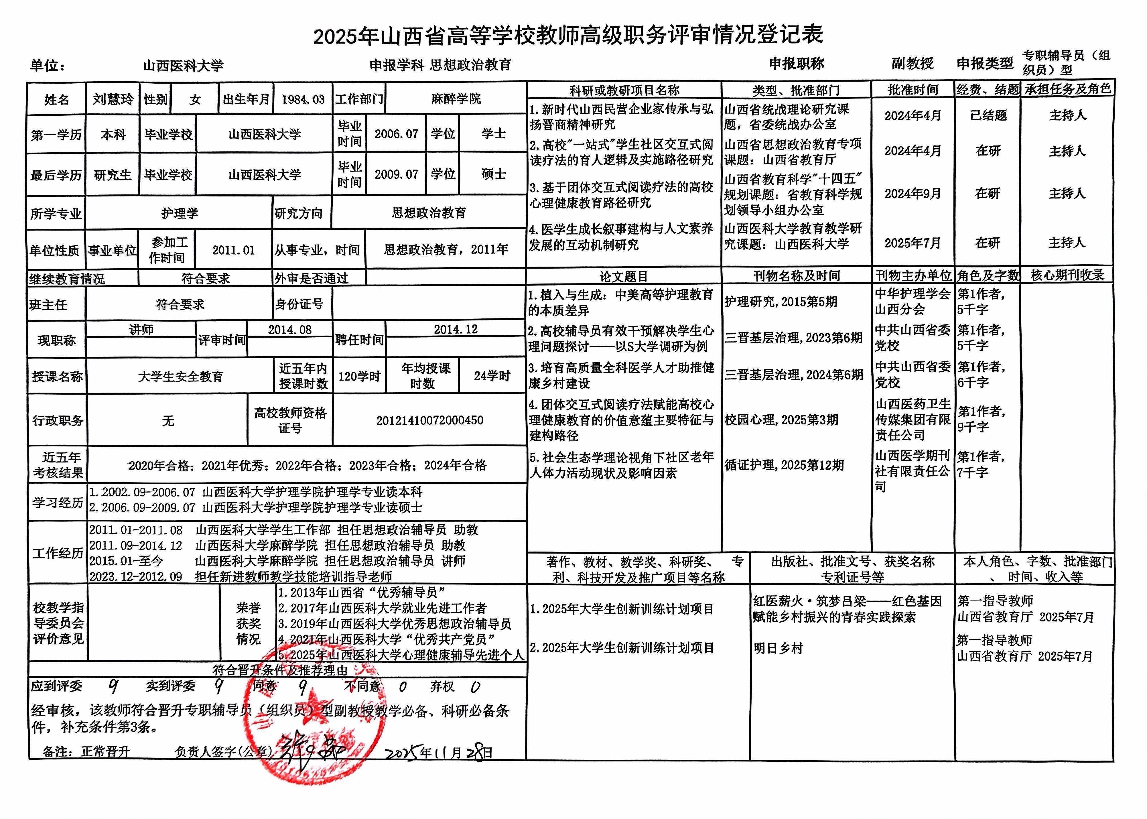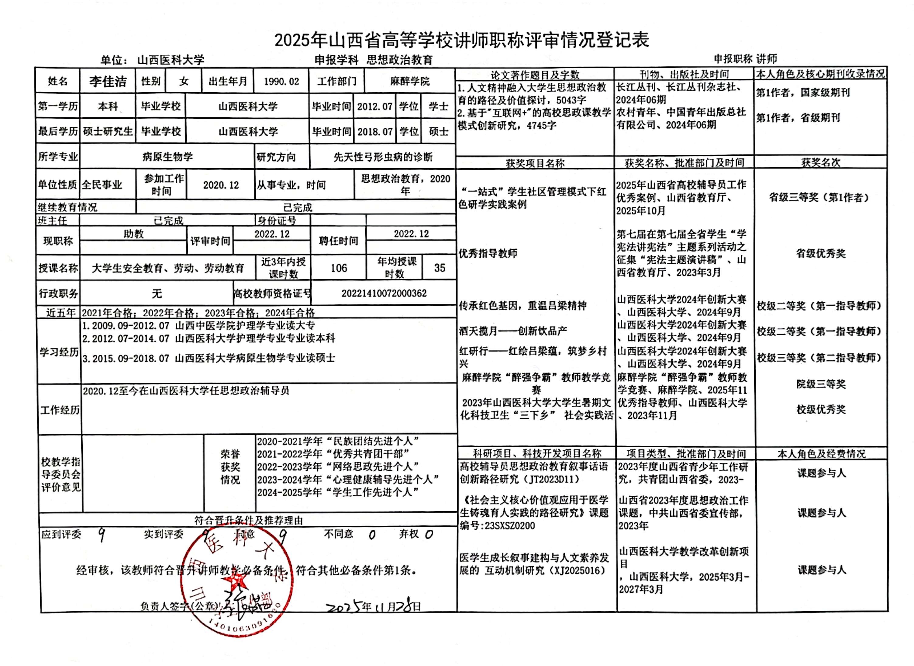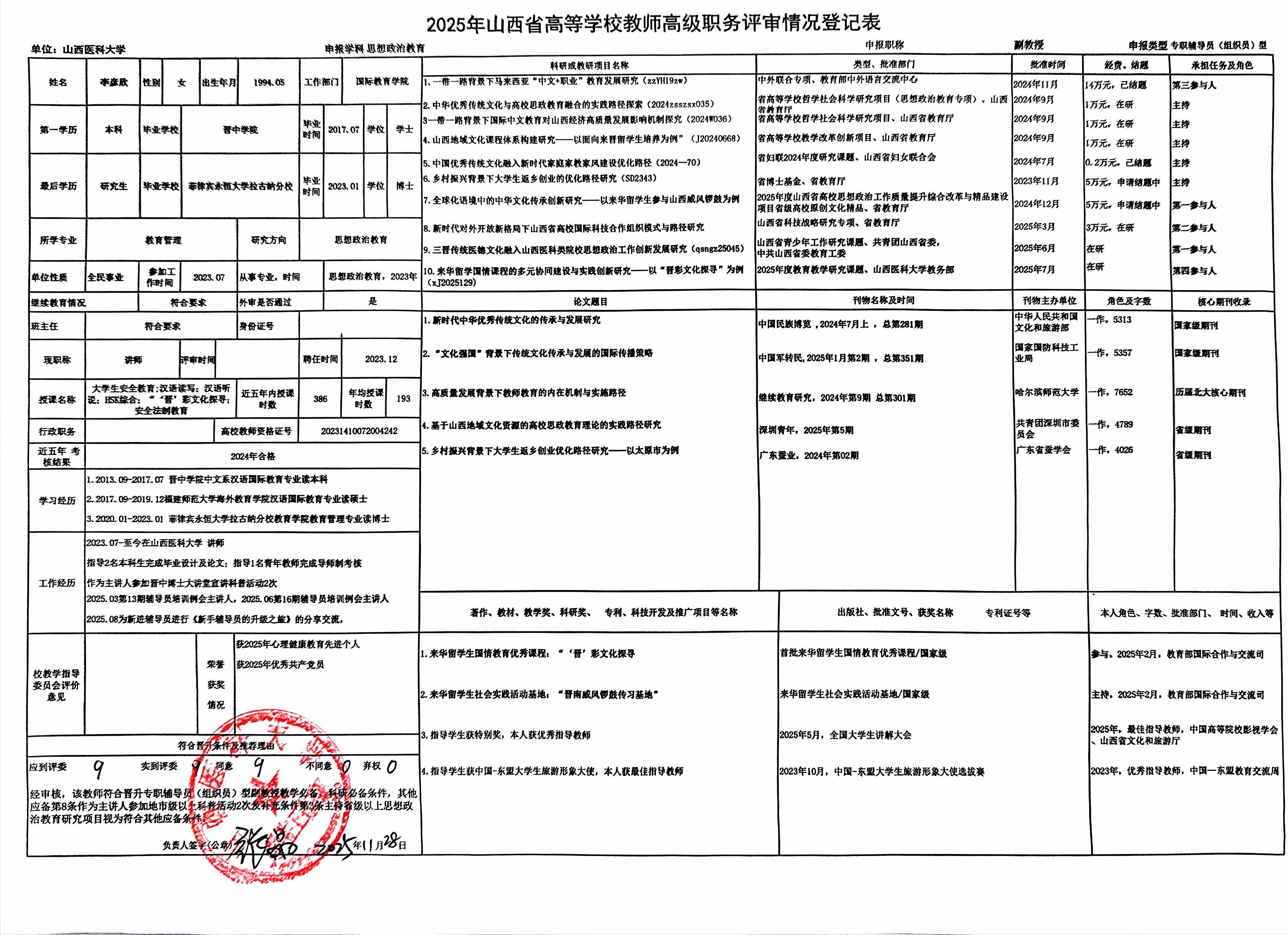 根据《山西省人力资源和社会保障厅关于印发<职称评审管理实施细则>的通知》(晋人社厅发〔2021〕28 号)、《关于做好2025 年度全省职称评审工作的通知》(晋人社厅函〔2025〕560号)、《关于开展 2025 年度全省高等学校教师高级职称评审工作的通知》(晋教师函〔2025〕52 号)、《关于开展 2025 年度全省实验系列高级职称评审工作的通知》(晋教师函〔2025〕28 号)、《山西医科大学职称评审和聘任管理办法(试行)》(山医大党〔2024〕59 号)精神,经专职辅导员(组织员)型教师职称评审组评审,石璟等13人符合申报条件,同意推荐以下人员申报相应职称,现将符合条件人员情况予以公示(详见附表),公示时间为11月28日-12月5日,公示期为五个工作日。