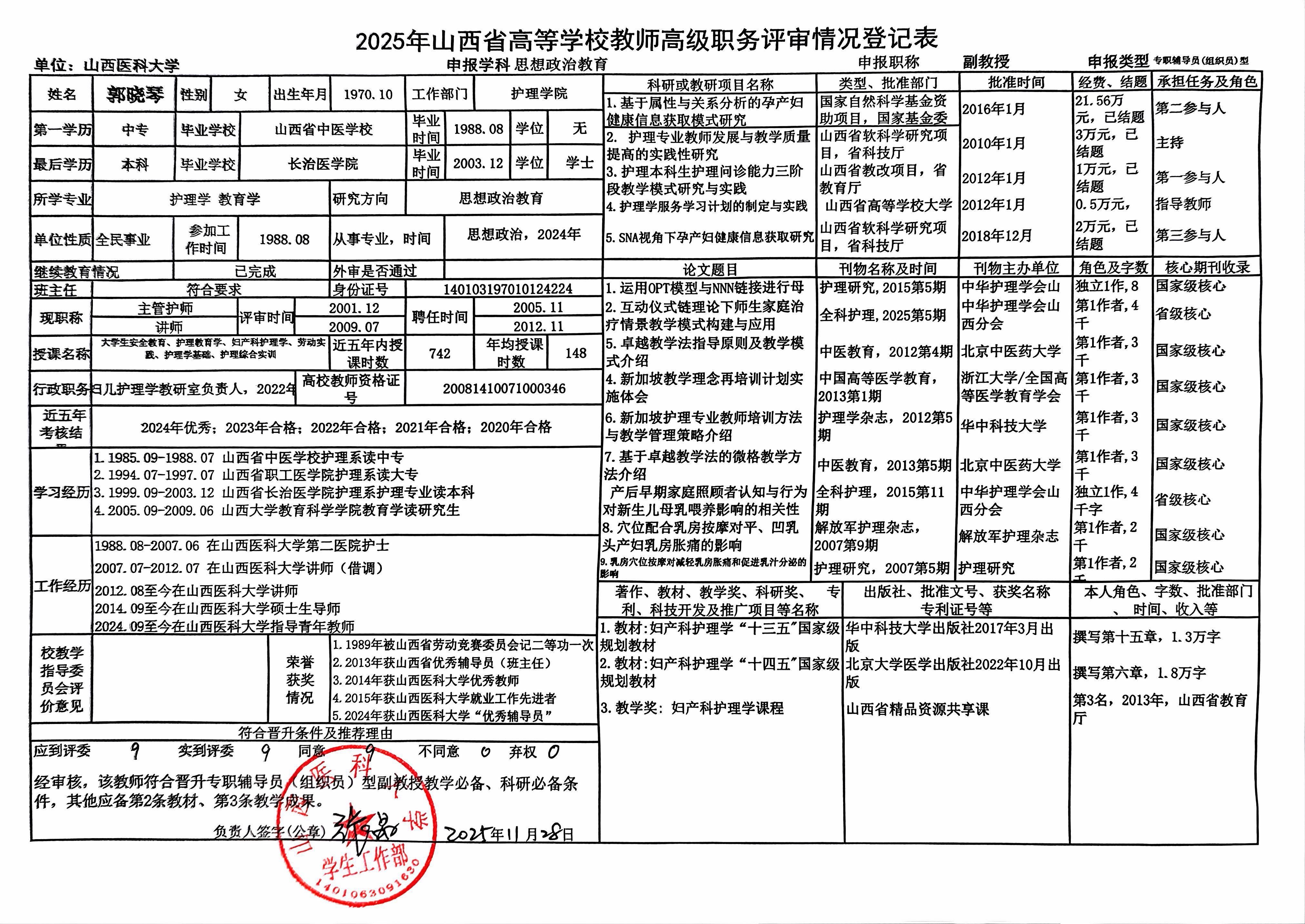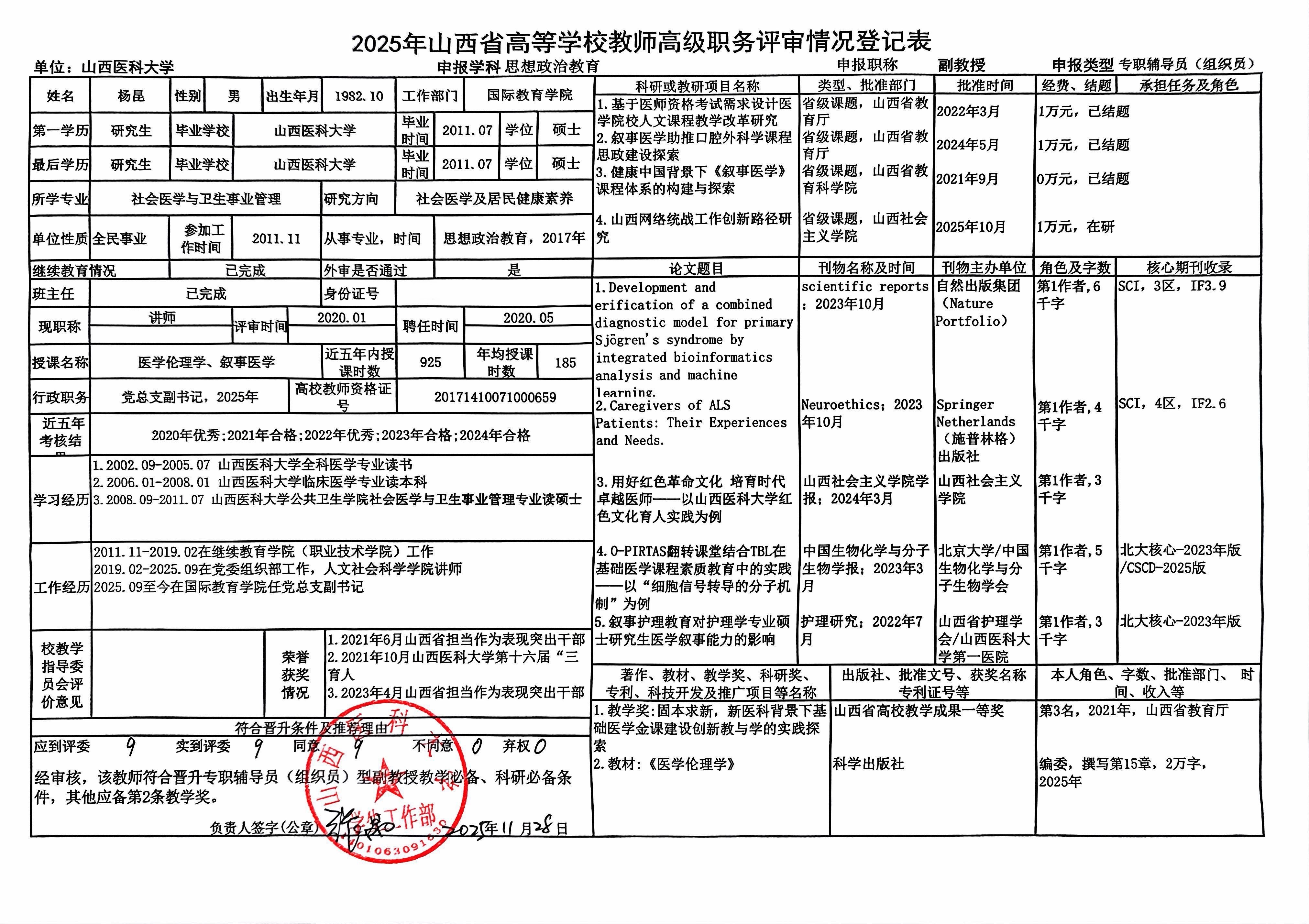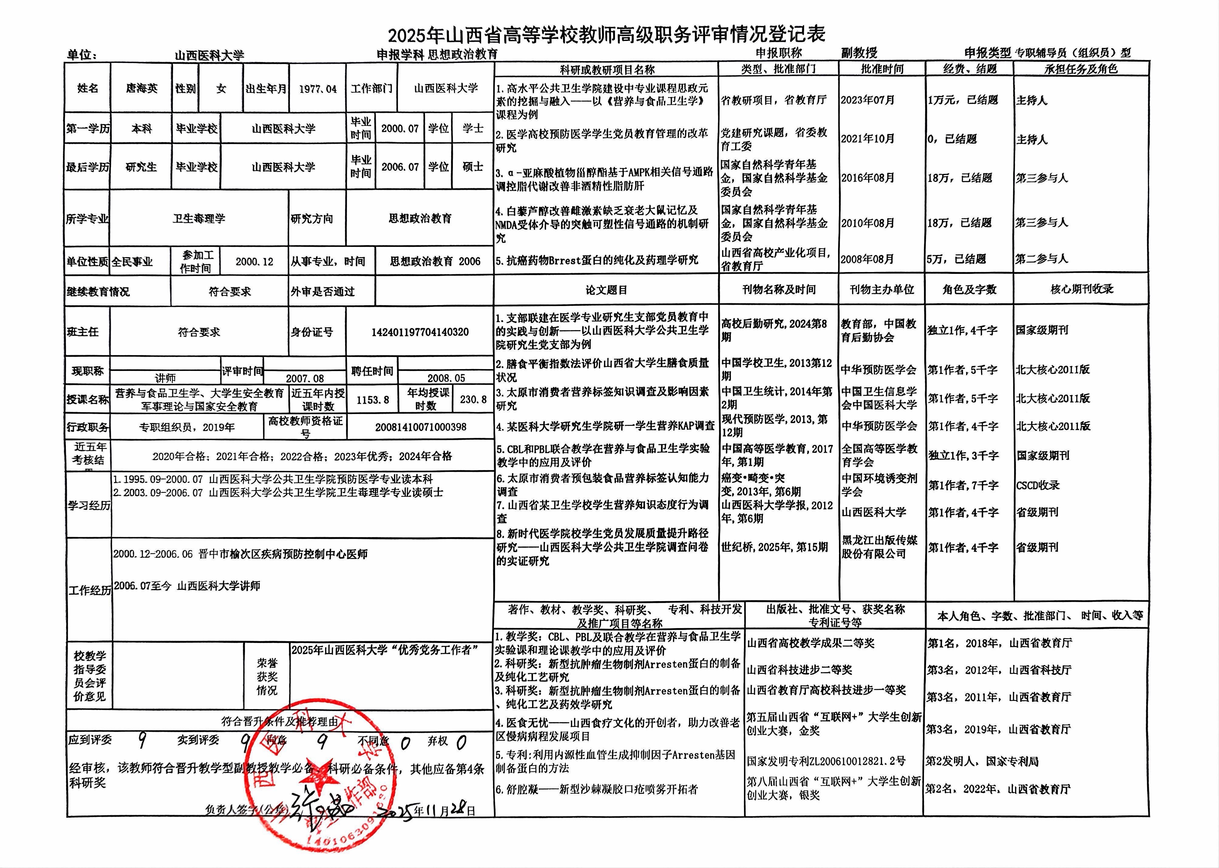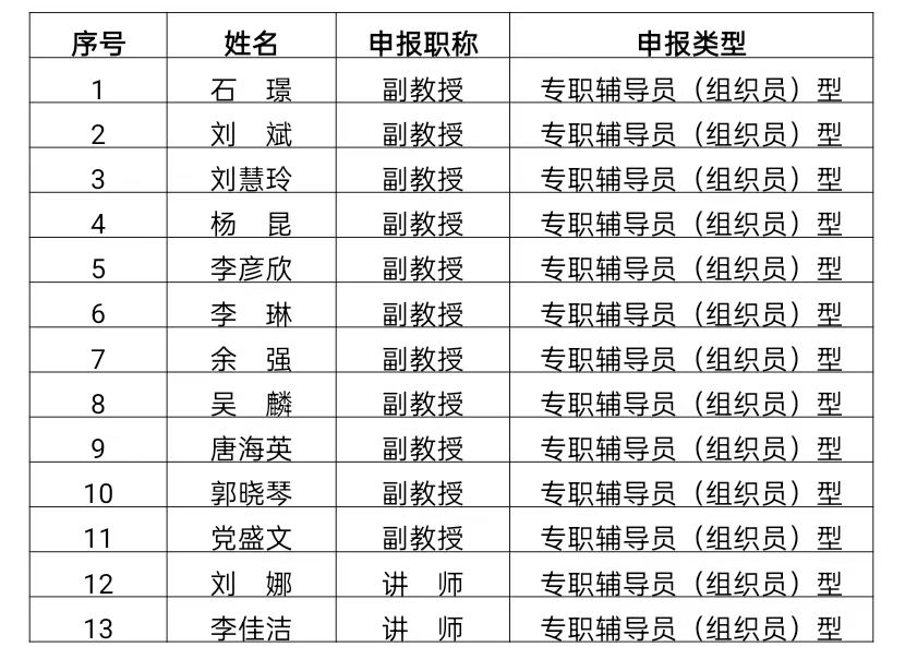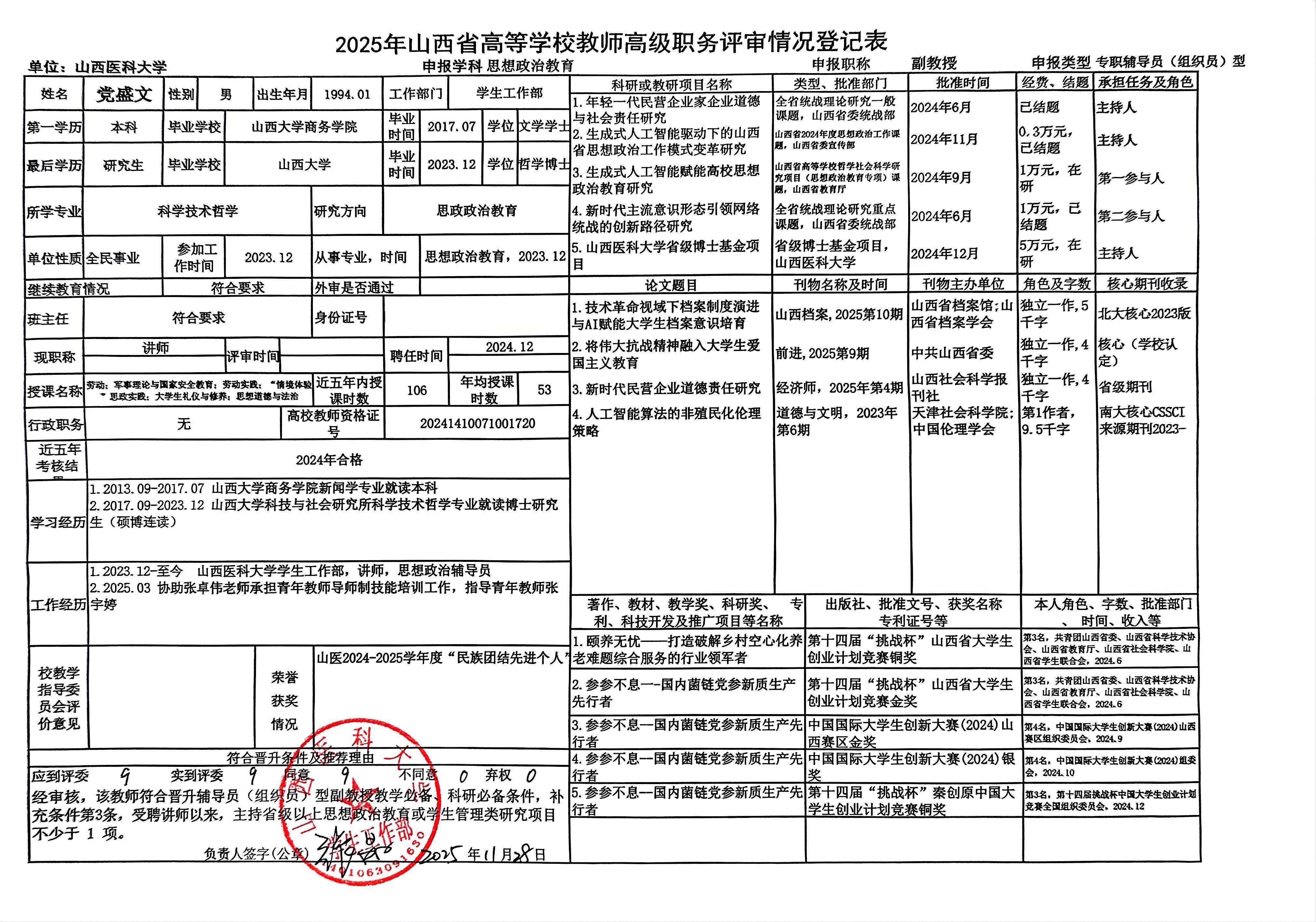 根据《山西省人力资源和社会保障厅关于印发<职称评审管理实施细则>的通知》(晋人社厅发〔2021〕28 号)、《关于做好2025 年度全省职称评审工作的通知》(晋人社厅函〔2025〕560号)、《关于开展 2025 年度全省高等学校教师高级职称评审工作的通知》(晋教师函〔2025〕52 号)、《关于开展 2025 年度全省实验系列高级职称评审工作的通知》(晋教师函〔2025〕28 号)、《山西医科大学职称评审和聘任管理办法(试行)》(山医大党〔2024〕59 号)精神,经专职辅导员(组织员)型教师职称评审组评审,石璟等13人符合申报条件,同意推荐以下人员申报相应职称,现将符合条件人员情况予以公示(详见附表),公示时间为11月28日-12月5日,公示期为五个工作日。
