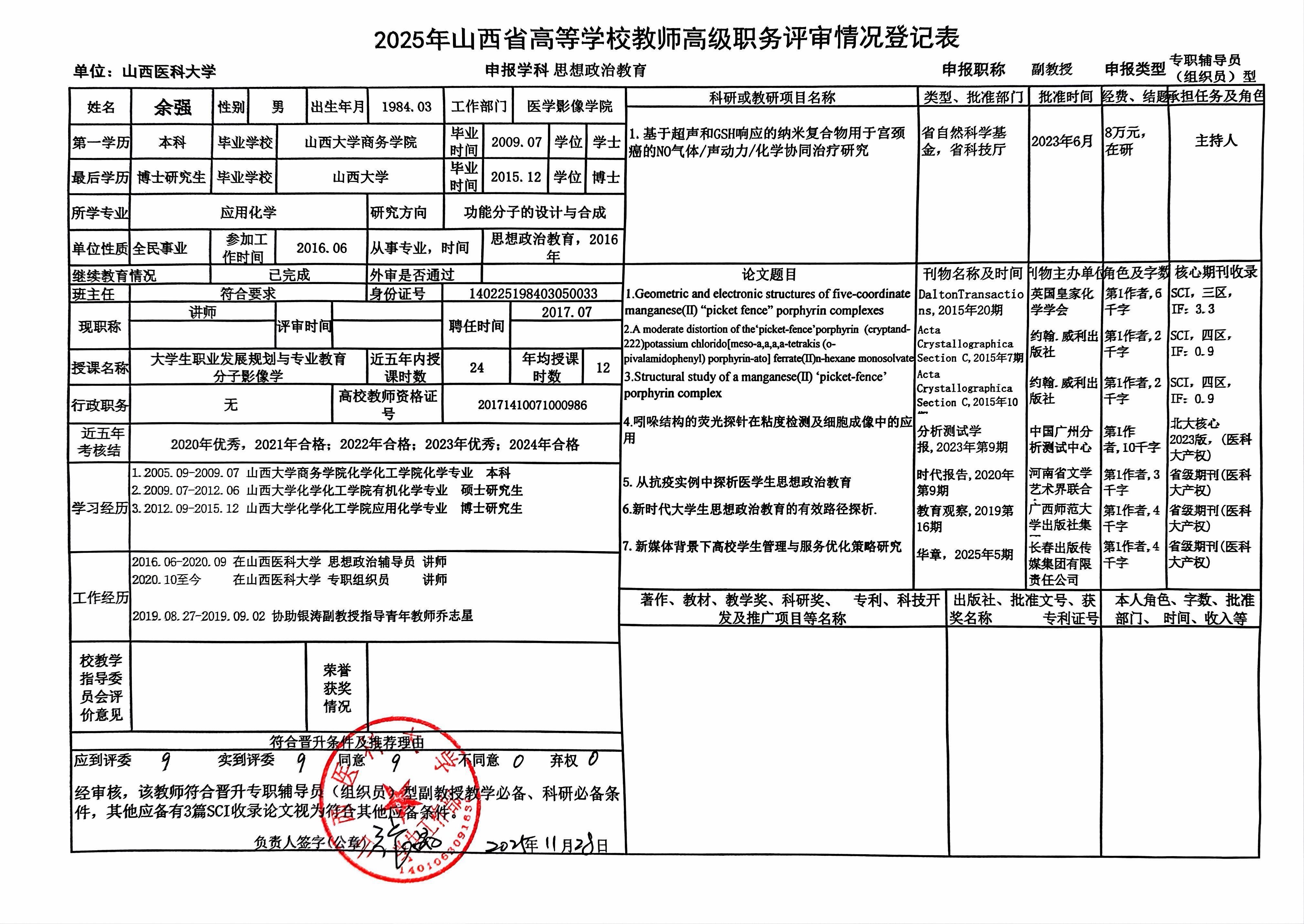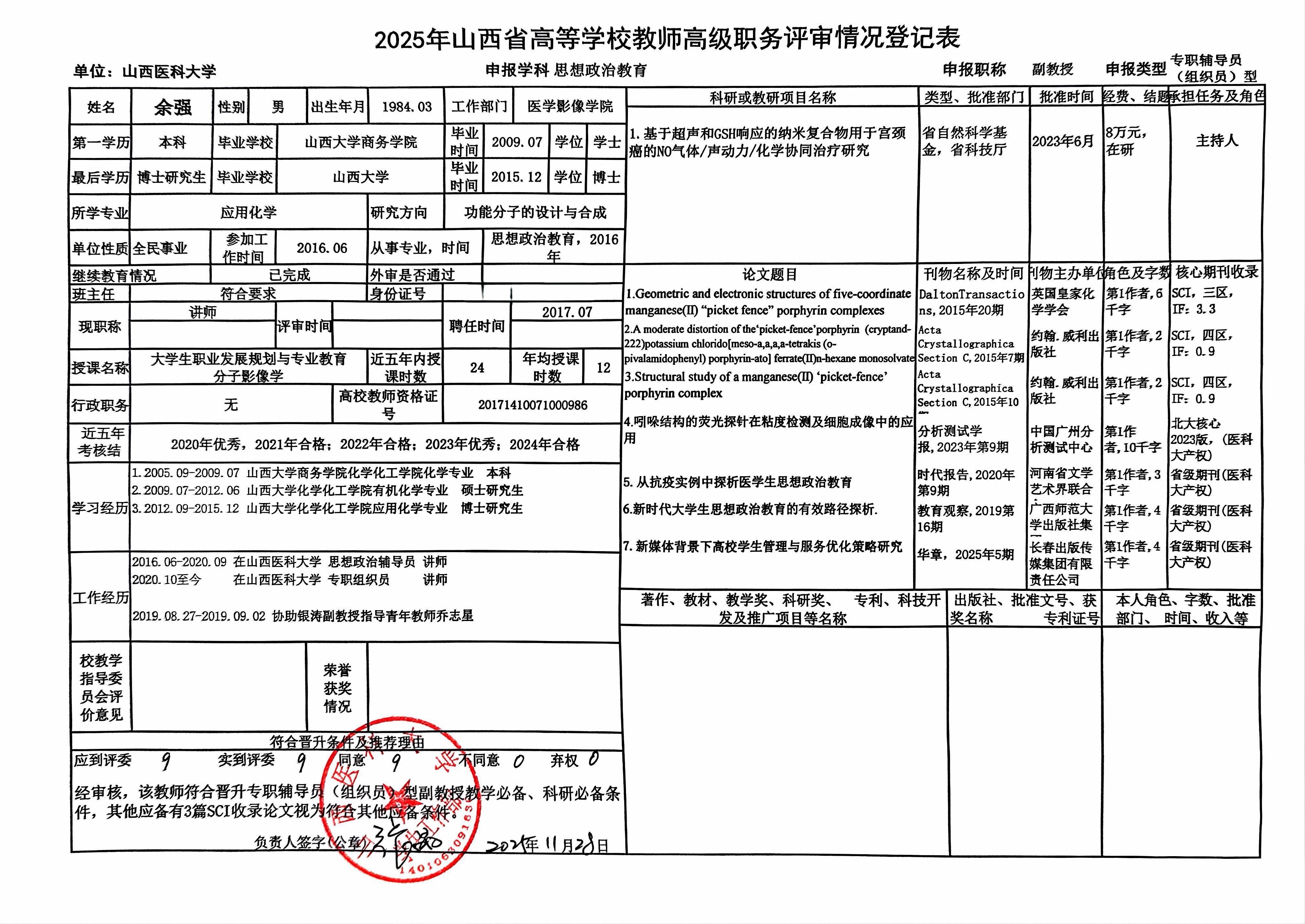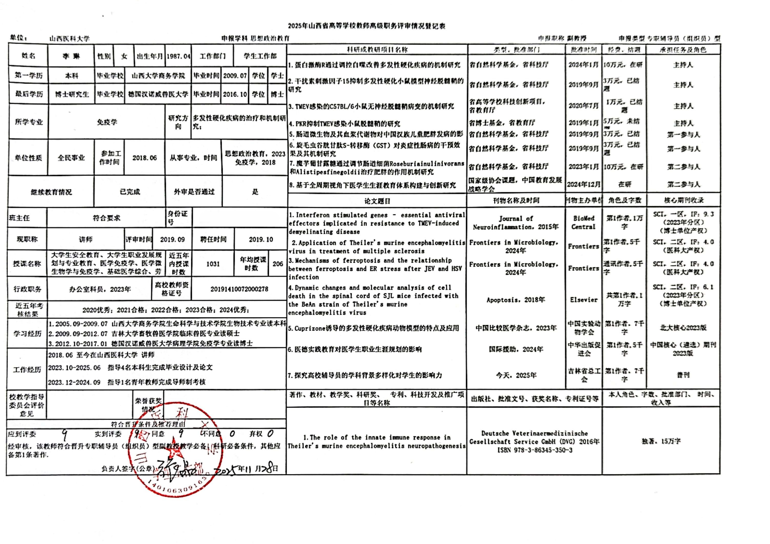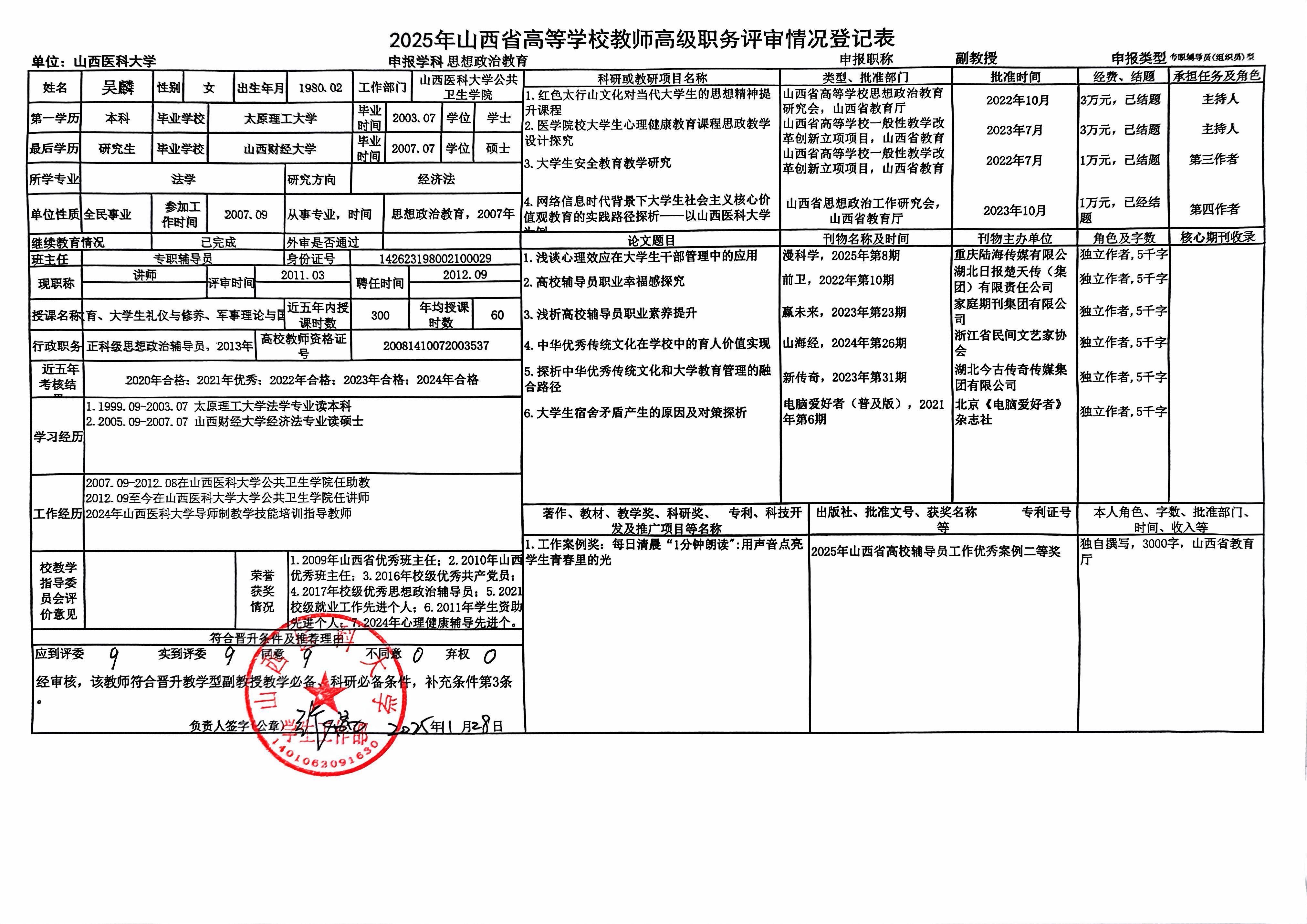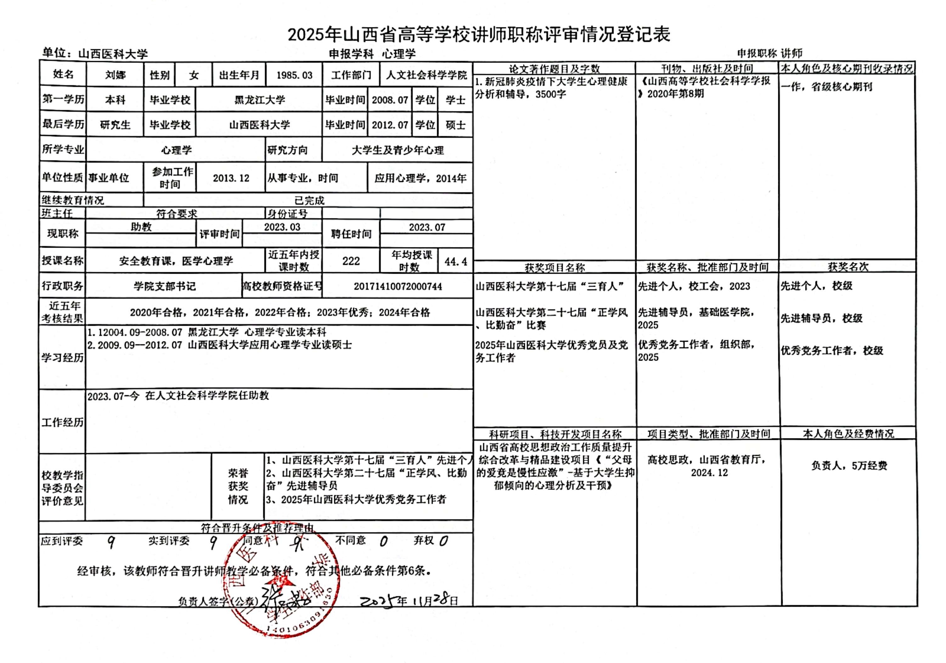 根据《山西省人力资源和社会保障厅关于印发<职称评审管理实施细则>的通知》(晋人社厅发〔2021〕28 号)、《关于做好2025 年度全省职称评审工作的通知》(晋人社厅函〔2025〕560号)、《关于开展 2025 年度全省高等学校教师高级职称评审工作的通知》(晋教师函〔2025〕52 号)、《关于开展 2025 年度全省实验系列高级职称评审工作的通知》(晋教师函〔2025〕28 号)、《山西医科大学职称评审和聘任管理办法(试行)》(山医大党〔2024〕59 号)精神,经专职辅导员(组织员)型教师职称评审组评审,石璟等13人符合申报条件,同意推荐以下人员申报相应职称,现将符合条件人员情况予以公示(详见附表),公示时间为11月28日-12月5日,公示期为五个工作日。