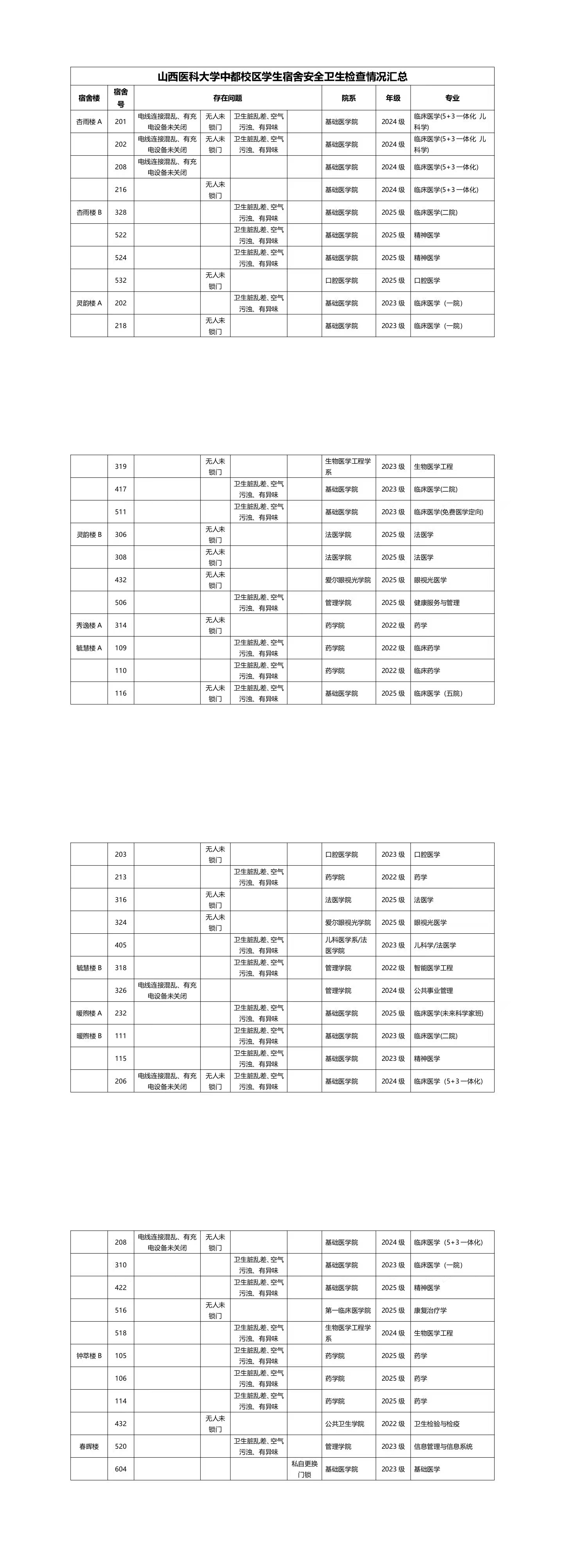 为进一步加强我校学生宿舍安全管理工作,消除各类安全隐患,增强学生的安全防范意识,培养学生良好的生活习惯,创造良好的育人环境,确保学校安全稳定发展。由学生工作部联合研究生学院党委、保卫部、后勤保障部于11月26日下午在中都校区对学生宿舍进行了安全卫生大检查。针对此次检查中存在的问题,各学院(系、部)需予以高度重视,并组织辅导员深入宿舍,核查情况,及时整改,以消除安全隐患。具体检查情况汇总如下: