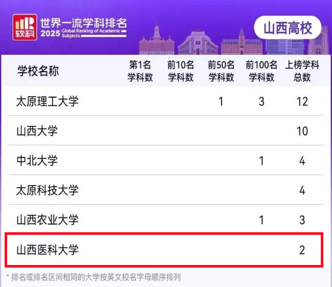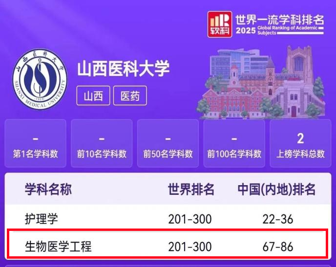 11月18日,全球权威高等教育评价机构软科正式发布2025“软科世界一流学科排名”(GRAS),山西高校凭借扎实的学科建设与科技创新突破再攀高峰,6所高校的35个学科成功上榜,其中,我校生物医学工程学科凭借深厚的学科积淀、鲜明的医工融合特色与突出的育人成果,成功入选世界一流学科名单,成为山西高等教育科创领域的亮眼成果。