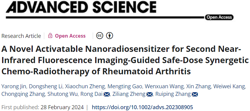 2024年2月28日,山西医科大学张瑞平、Zheng Ziliang、Dai Rong共同通讯在Advanced Science在线发表题为“A Novel Activatable Nanoradiosensitizer for Second Near-Infrared Fluorescence Imaging-Guided Safe-Dose Synergetic Chemo-Radiotherapy of Rheumatoid Arthritis”的研究论文,该研究将临床批准的药物顺铂(DDP)和吲哚菁绿(ICG)封装在明胶壳内,开发了一种新型可激活纳米放射增敏剂-40(IRnR-40),实现了第二近红外光(NIR-IIFL)成像引导的安全剂量协同化疗。