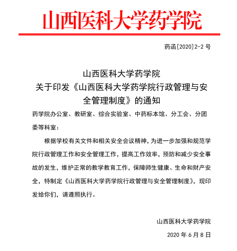 山西医科大学药学院关于印发《山西医科大学药学院行政管理与安全管理制度》的通知