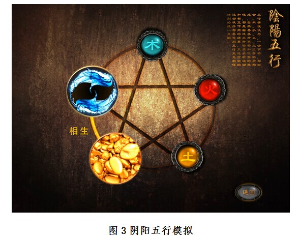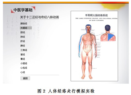 模拟演示请点击:人体经络、阴阳五行、中药房游戏 数字中医药模块主要分为人体经络、阴阳五行、模拟药房三个主要模拟系统。人体经络系统通过数字动画模拟真实人体经络走行,直观展示经络的走行及与疾病的相关性;阴阳五行系统采用动画形式形象展示中医气血阴阳和五脏六腑等经典中医理论,达到对中医学理论的深入展示;模拟药房设计成游戏形式,利用多媒体模拟仿真系统通过模拟真实药房场景,使学生在实验室就能身临其境体验中药房抓药、药材查询、煎药等过程。依托数字中医药模块,中心目前开展的主要模拟仿真实验项目有人体主要经络走行模拟实验、阴阳五行相生相克模拟实验及400种中药材的药房体验共三项开放实验,作为中医基础理论、中药学、中药方剂学等课程实验教学的重要内容,深受学生好评。见图1、2、3、4。