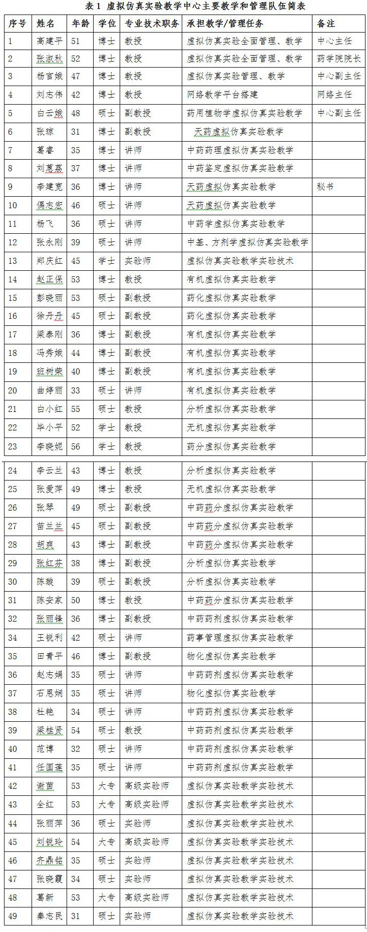 本实验中心依托中药学一级学科,整合药学院及中药标本馆资源,具有一支年龄、学源、学历等方面合理协调的教学建设、运行维护的专职队伍: