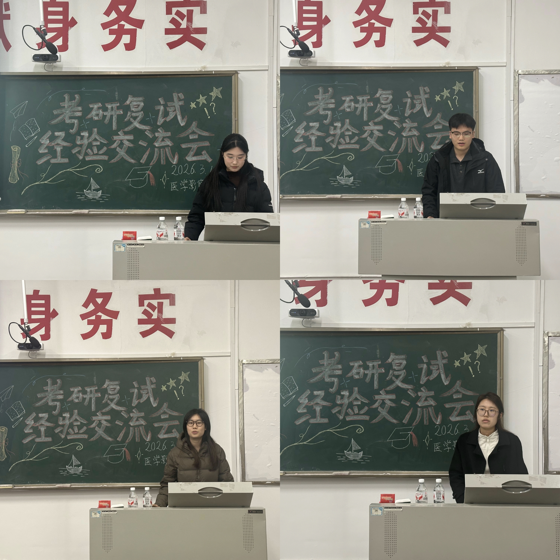 会上,党委副书记郭晔向通过2026年考研国家线的同学表示祝贺,并希望同学们能结合学长学姐的备考经验科学备考,取得理想成绩。随后,学院2025级研究生分别从放射影像学、超声医学、核医学、影像医学与核医学、医学影像技术不同方向的复试为同学们做经验分享。