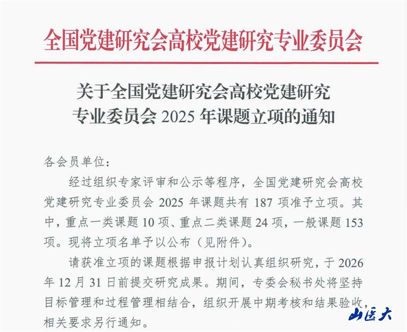 近日,全国党建研究会高校党建研究专业委员会公布了2025年课题立项结果。经专家评审与公示,全国260余所高校申报的1000余项课题中187项获批,包括重点课题34项(含一类10项、二类24项)和一般课题153项。我校护理学院学生第三党支部书记、明德润心辅导员工作室负责人郭翠梅主持申报的课题《心理学融入党建工作的实践探索与理论创新研究——基于积极心理学与社会支持理论的跨学科融合路径》获批立项,为我省高校本次获批的两项课题之一。