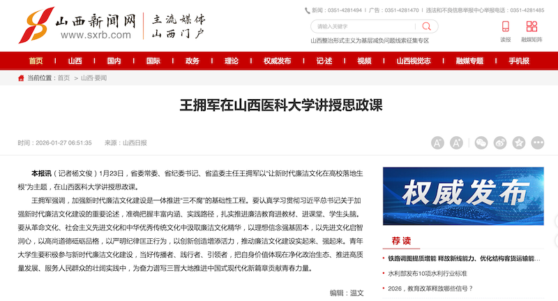近日,我校在迎泽校区召开统一战线成员交流座谈会暨新年联谊会。校党委书记王军出席会议并讲话。学校相关部门负责人,我校附属第一医院和第二医院负责统战工作的同志,学校6个民主党派和2个统战团体负责人及相关代表欢聚一堂,在温馨祥和、团结奋进的氛围中共叙情谊、共谋发展、共话未来。校党委常委、副校长焦向英主持会议。会上,王军通报了学校2025年取得的亮点工作和2026年重点工作,代表校党委对统一战线成员长期以来对...