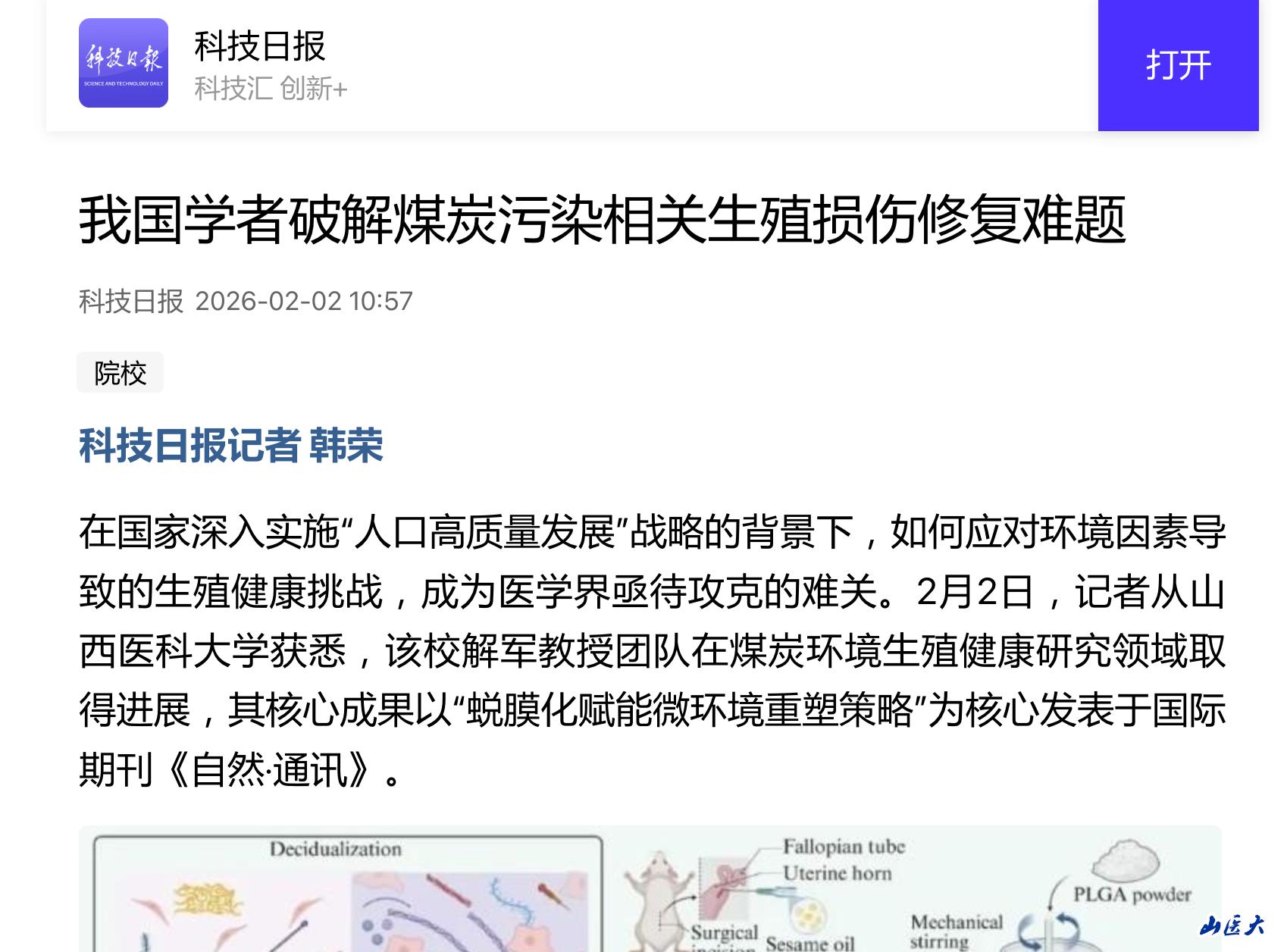 近日,我校解军教授团队在煤炭环境生殖健康研究领域取得突破,核心成果刊载于《Nature Communications》,标志着我校在环境医学与生殖再生交叉领域的研究跻身国际先进行列,为“健康中国”战略下的出生缺陷防控提供了全新技术路径。煤炭作为我国能源结构的重要组成部分,其开采、燃烧过程中产生的PM2.5、多环芳烃等污染物,已被证实对人类生殖健康构成严重威胁。权威研究显示,高浓度煤炭污染暴露会导致女性早发性绝经风险增加1...