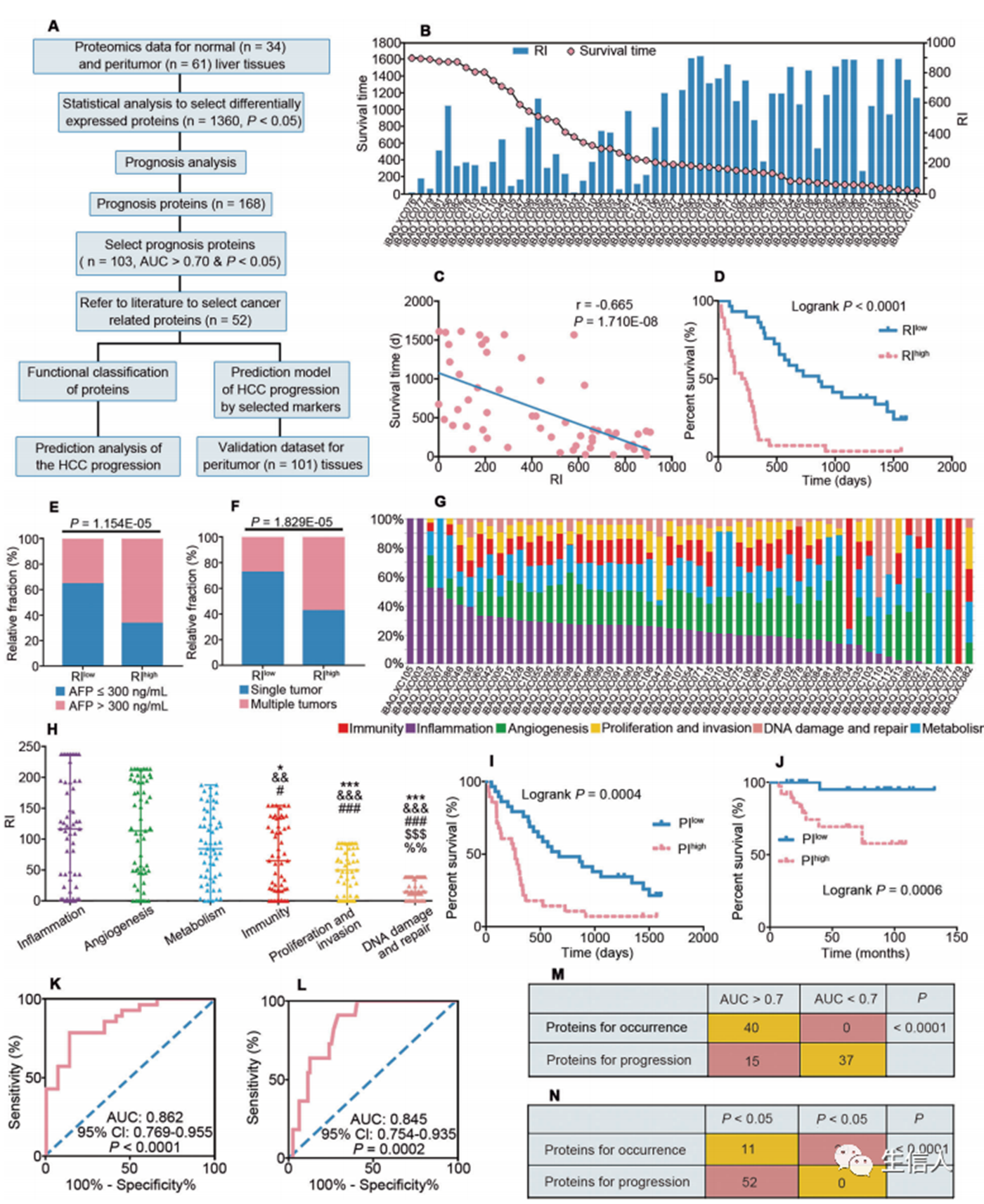进一步分析蛋白功能与HCC进展之间的相关性,发现PME-P中有52个蛋白,可按功能分为6类(图3A)。然后使用RIs来检验各种因素对进展和个体变异的影响。与PME-O患者相似,高RI患者更可能有更短的生存时间、更高的AFP水平、且存在多个而不是单个的肿瘤区域(图3B-F)。在本研究中,炎症、血管生成和代谢的平均RIs远高于其他因素,是PME中HCC进展的主要影响因素(图3G和H)。随后构建的进展预测模型,涉及三个标记物(炎症蛋白CMPK2;血管生成蛋白TYMP;和代谢蛋白NADSYN1),低RI组的中位生存时间明显长于高RI组(图3I和J)。同时,ROC分析结果显示,该模型可以更好地预测疾病进展(图3K和L),提示该模型可能对HCC进展的风险具有良好的预测价值。