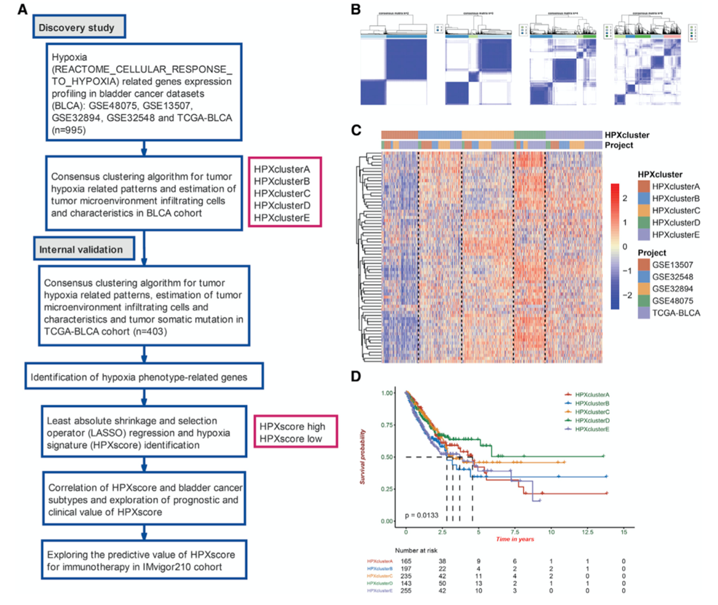 瘤内缺氧和免疫与肿瘤患者的预后高度相关。然而,目前上没有关于膀胱癌(BLCA)缺氧反应和免疫方面的研究。本研究,作者使用非监督一致性聚类方法研究1343例BLCA患者的缺氧反应模式和BLCA患者临床病理特征的关系。共鉴定到五种缺氧反应模式,使用LASSO-Cox回归分析构建HPXscore。HPXscore -低组的特征为免疫激活和DNA损伤修复较高,为免疫炎症表型。HPXscore -高组中基质相关通路激活,为免疫排斥表型。此外,HPXscore是独立预后因子,可以准确预测BLCA患者的免疫治疗反应。因此,本研究全面的阐述了BLCA患者的缺氧特征,有助于解释免疫逃逸的潜在机制并阐明BLCA的缺氧修饰和免疫检查点靶向免疫治疗。