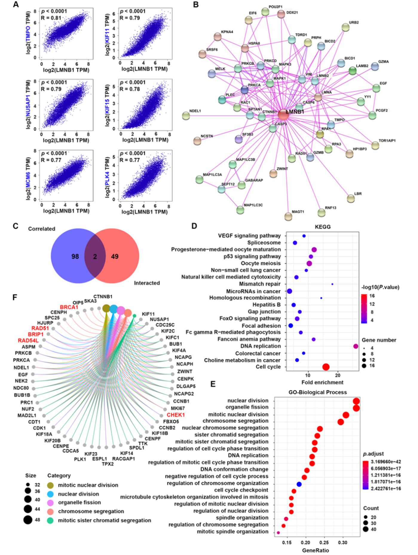 为进一步阐明LMNB1在肿瘤发生发展中的分子机制,作者筛选LMNB1相关基因进行通路富集分析。使用GEPIA2获取TCGA癌症类型中与LMNB1表达水平相似的100个基因,其中最相关的6个基因为TMPO,KIF11,NUSAP1,KIF15,MCM6和PLK4(图5A)。使用STRING获取与lamin B1互作的50个基因(图5B)。韦恩图表明两个基因集的交集有2个基因分别为TMPO和ZWINT(图5C)。对这两个基因集进行GO和KEGG富集分析,细胞循环和DNA富集通路显著富集(图5D),核分裂,有丝分裂和染色体分裂等功能显著富集(图5E和5F)。