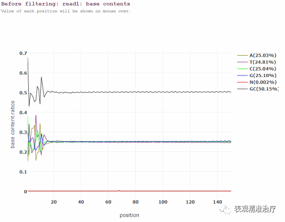fastp对5个碱基长度的所有组合的出现次数进行了统计,然后把它放在了一张表格中,表格的每一个元素为深背景白字,背景越深,则表示重复次数越多。这样,一眼望去,就可以发现有哪些异常的信息。鼠标可停留在某一具体组合上看出现次数和平均占比。