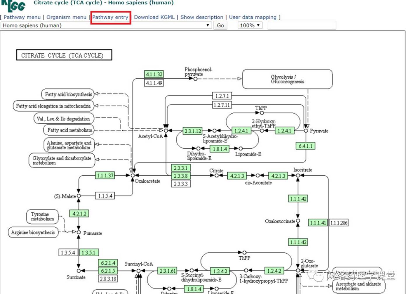 在上图点击“reference pathway”框的三角,可以选择物种,得到物种特异的通路。如下图就是人的三羧酸循环通路。