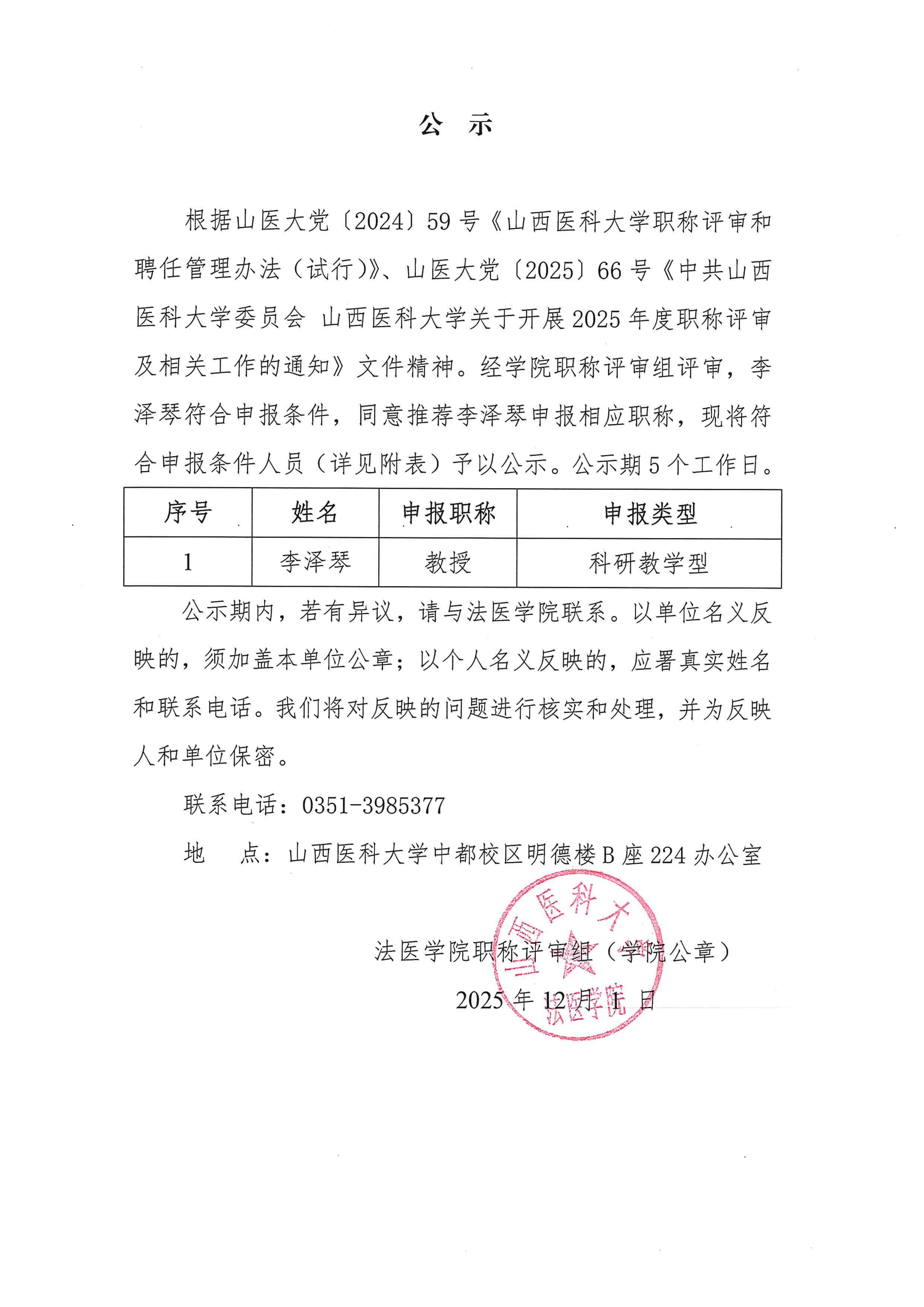 2025年度法医学院高级职称申报推荐公示