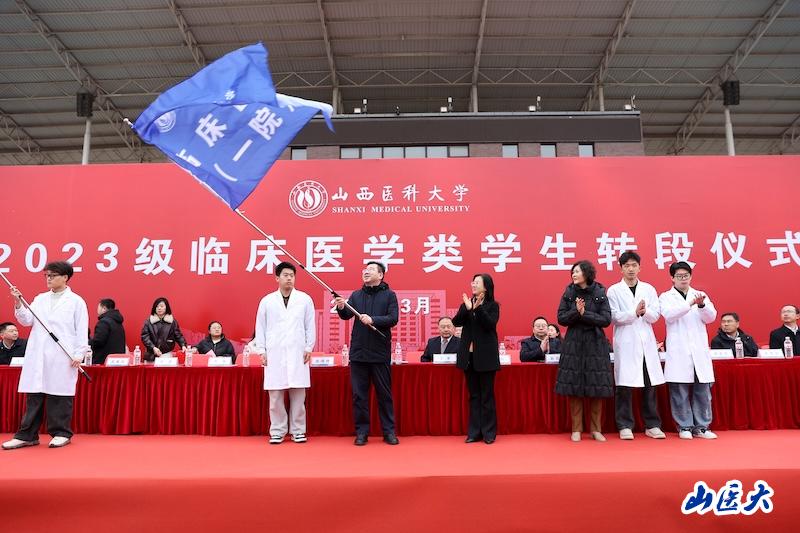 武志芳向各临床医学院授旗。一面面象征着医学使命、责任担当的旗帜交接传递,寓意着医者初心的接力、医学使命的传承,标志着全体转段学生正式告别基础理论学习阶段,昂首迈入临床实践新征程。