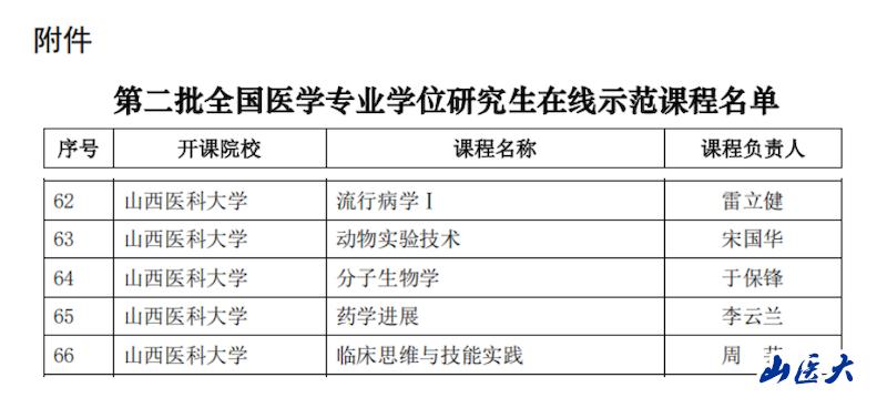 近日,全国医学专业学位研究生教育指导委员会公布第二批全国医学专业学位研究生在线示范课程认定结果,30所高校的94门课程入选。我校5门课程成功上榜,入选数量位居全国高校第五、医药类高校并列第一。