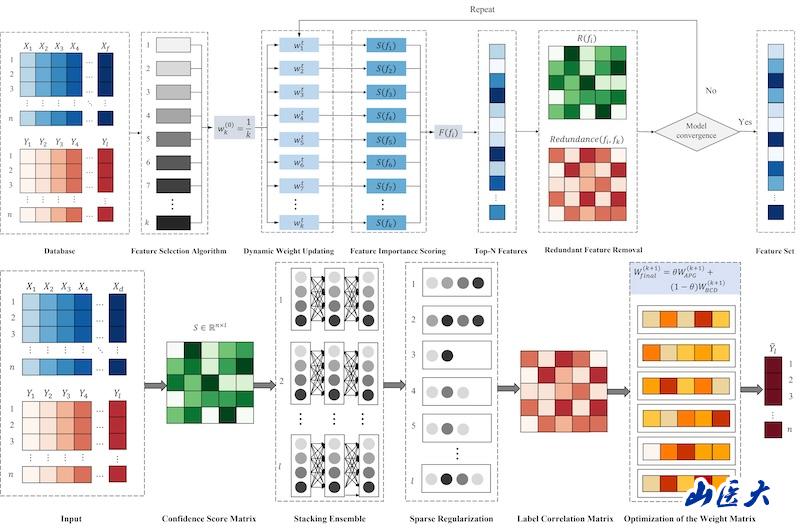 该研究提出动态加权多标签集成特征选择算法(DWML-EFS)与多标签线性加权堆叠集成算法(MLLWSE)。在提升特征选择效率的同时可以精准捕捉基分类器间的相互依赖关系,充分利用标签关联性提升预测效果。