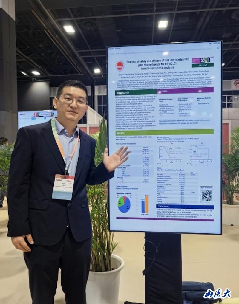 近日,由我校附属第二医院肿瘤科牵头,联合山西白求恩医院、太钢总医院、晋中市第三人民医院、晋城大医院等多家医疗中心,基于真实世界数据开展的“替雷利珠单抗联合化疗一线治疗广泛期小细胞肺癌的疗效与安全性”及“尼达尼布用于预防不可切除非小细胞肺癌放射性肺炎的一项前瞻性、多中心Ⅱ期研究”两项研究成功入选2025年欧洲肿瘤内科学会亚洲年会(ESMO Asia),以壁报形式展出于2025 ESMO Asia新加坡会场。
