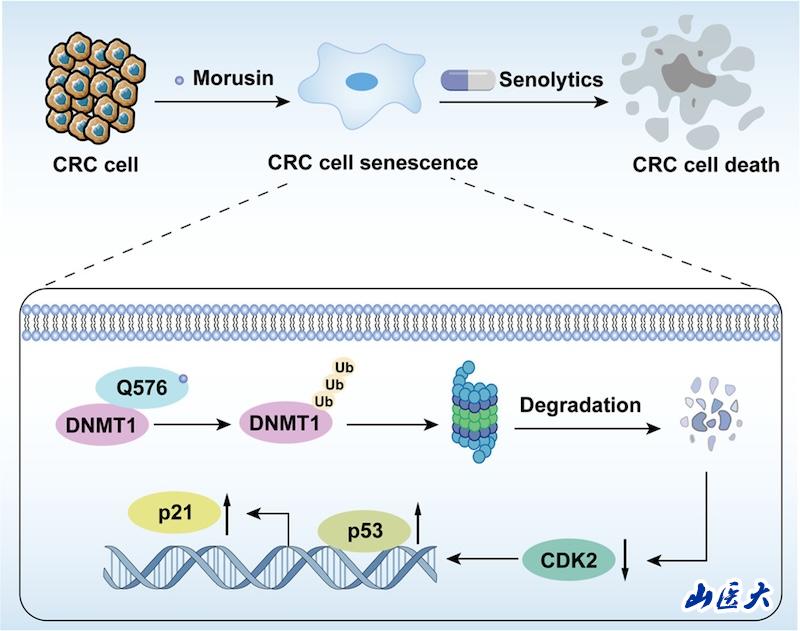 该研究首次系统揭示,天然化合物桑根皮素(Morusin)可特异性靶向DNA甲基转移酶1(DNMT1),通过表观遗传调控机制诱导结肠癌细胞衰老,并显著增强该细胞对“衰老细胞清除疗法”(Senolytic Therapy)的敏感性。研究不仅阐明了Morusin在结肠癌治疗中的新机制,也为“诱导衰老—靶向清除”的联合治疗策略提供了理论依据。