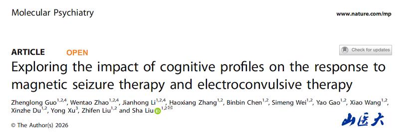 近日,我校附属第一医院两项研究成果相继发表于精神医学领域顶级期刊《Molecular Psychiatry》(Nature旗下,中国科学院一区TOP,影响因子10.1),分别聚焦青少年抑郁症生物标志物鉴定、认知功能对惊厥治疗的影响两大方向。