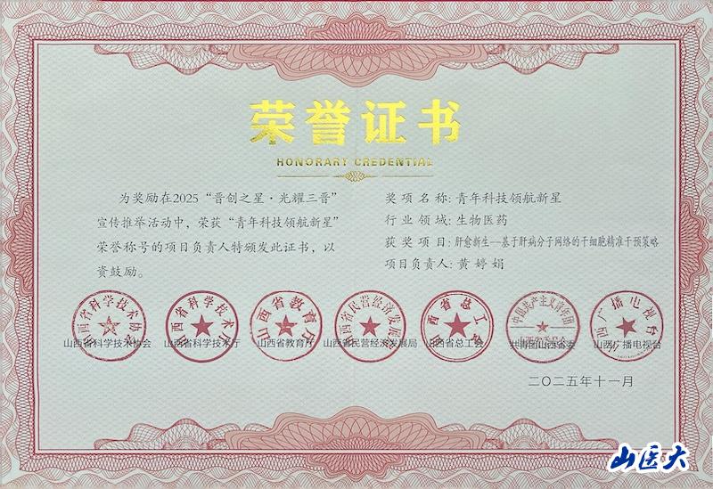 近日,由省科协、省科技厅等七部门联合举办的首届“晋创之星 光耀三晋”科技工作者宣传推举活动圆满收官,这场科技盛会汇聚了来自装备制造、生物医药、绿色能源和农业等9大行业领域的科技创新企业和科创领军人物。我校黄婷娟副教授凭借在肝病基础与临床研究领域的创新性成果,以及在医学科普工作中的突出贡献,斩获 “青年科技领航新星” 荣誉称号。
