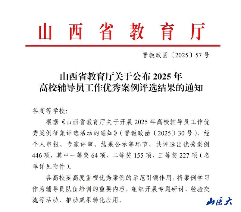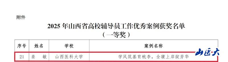 育人之功结硕果,学风建设绽新花。近日,山西省教育厅2025年高校辅导员工作优秀案例评选结果正式公布,我校药学院思想政治辅导员姜敏老师携《学风筑基育桃李,全寝上岸绽芳华》工作案例,在全省众多参评作品中脱颖而出,成功斩获省级一等奖。