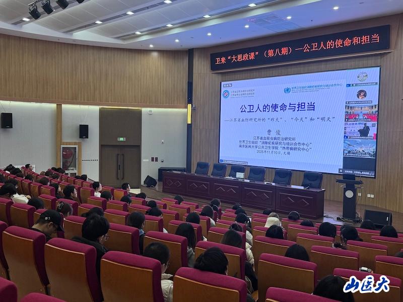 11月10日晚,由南京医科大学、北京大学、复旦大学、山西医科大学等22所高校公共卫生学院,联合江苏省血吸虫病防治研究所、中国疾病预防控制中心共同举办的“卫来‘大思政课’”——“公卫人的使命和担当”在江苏省血吸虫病防治研究所隆重开讲,江苏省血吸虫病防治研究所所长、二级研究员曹俊应邀作《昨天、今天和明天》专题讲座。本次讲座采用线上线下联动方式,各院校设立分会场共同参与。我校在中都校区至公楼一层报告厅同步线上直播,公共卫生学院党委副书记蔚钰琼出席活动,学院200余名师生现场聆听,在深入的思想交流中共同感悟公卫精神,汲取奋进力量。