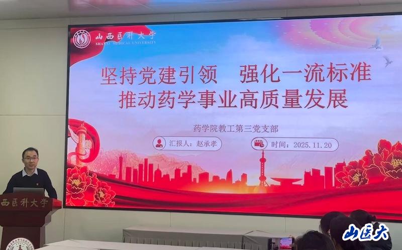 药学院教工第三党支部书记赵承孝以“坚持党建引领 强化一流标准 推动药学事业高质量发展”为题,分享了全国党建工作样板支部的建设经验。他指出,党建与业务的深度融合是驱动学科发展的关键,并具体介绍了在开展支部活动与科研实践中如何系统性地融入创新理念,以高质量党建引领,一体推进高质量教育、高水平人才培养,高效能科研攻关,推动药学事业高质量发展。