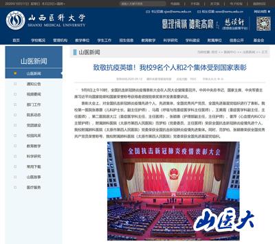 (在9月8日上午10时隆重召开的全国抗击新冠肺炎疫情表彰大会上,山西医科大学第一医院张惠蓉、马霞、王美霞,第二医院原大江、张颖惠、姜萍,附属肺科医院(太原市第四人民医院)范梦柏荣获全国抗击新冠肺炎疫情先进个人,我校附属肺科医院(太原市第四人民医院)党委荣获全国抗击新冠肺炎疫情先进集体。同时,范梦柏、张颖惠荣获全国优秀共产党员荣誉称号,附属肺科医院[太原市第四人民医院]党委荣获全国先进基层党组织)