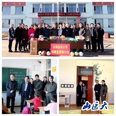 走访慰问结束后,帮扶工作队一行来到元堡子镇董半川学校,举行了决战完胜脱贫攻坚——山西医科大学教育扶贫捐赠仪式,捐赠仪式由董半川学校校长王荣儒主持。捐赠仪式上,党志峰、刁海鹏代表学校为学校捐赠了50台显微镜和近3000元的篮球、足球和跳绳等基础体育器材,希望帮助当地学校逐步改善教学和体育教育条件,给孩子们创造一个体育锻炼的良好环境,培养他们热爱体育运动的生活习惯。捐赠完毕后,校领导还实地走访查看了学校的校舍建设,了解了学生上课情况。