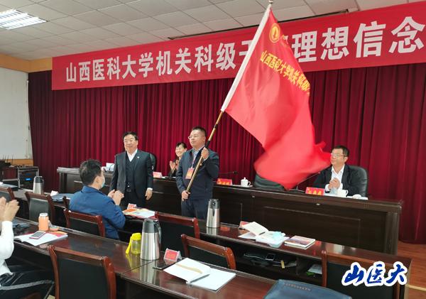 赵俊明为本次培训班授旗,培训班班长杨国栋接受班旗。