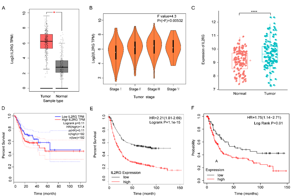 A-C:IL2RG的表达情况;D-F:IL2RG生存率分析