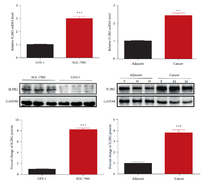 Western blot和RT-qPCR显示IL2RG在胃组织和胃细胞系中的表达水平
