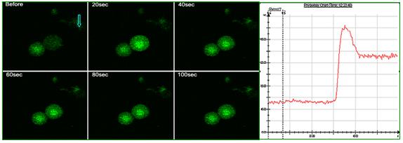 实验原理:Fluo 4-AM是的一种乙酰甲酯衍生物,通过培养,能够轻易进入细胞中。AM进入细胞后会被胞内酯酶所水解,产生的Fluo 4随后会和钙离子结合并发出荧光,细胞中钙离子含量越高绿荧光越强,通过检测绿色荧光强度值随时间的变化,得到Ca2+浓度随时间变化的曲线。